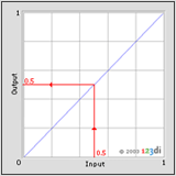 Below is a graph representing no enhancement. The x axis represents the color (gray level) of each pixel input from the raw image, and the y axis represents the resulting output in the enhanced image. For any value that is input, the exact same value is output. The red shows how an input of .5 results in an output of .5. This graph is the basis against which all enhancements are compared.