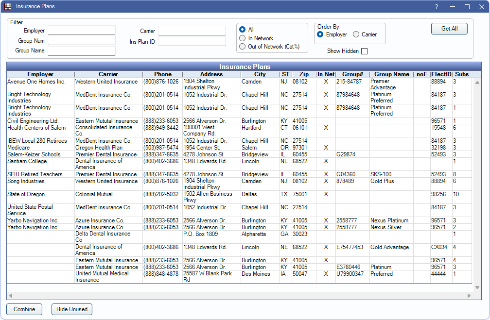 Show Hidden: Include/exclude plans that have been marked Hidden on the Edit Insurance Plan window.