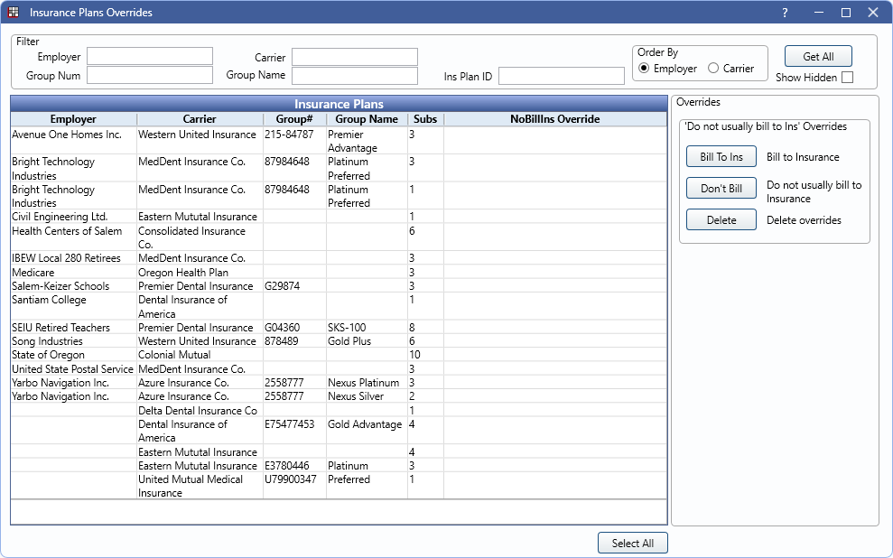 Overrides: Highlight insurance plans and use the buttons below to enable or delete insurance plan overrides.