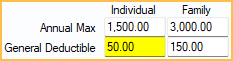 Annual Max: The family's annual maximum. Usually this value is entered in the Family column, Annual Max field on the Benefits Window.