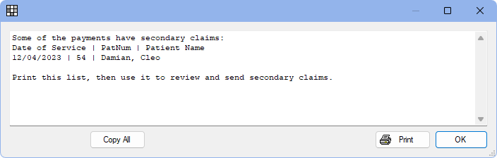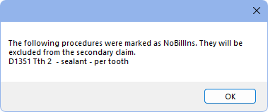 If all selected procedures are marked NoBill for Secondary, a warning is instead shown that no claim is created.
