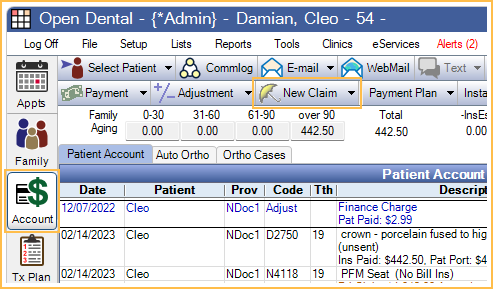 When creating the claim, highlight the procedures and click New Claim . A warning is shown explaining the procedure will be excluded from the insurance marked as NoBill.