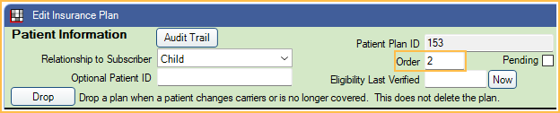 Follow the steps in Add Insurance to add primary and secondary plans. From the Edit Insurance Plan window, ensure the Order for the secondary plan is "2" and "1" for the primary plan. If the primary plan was added first, then the secondary added next, the order is automatically set correctly.