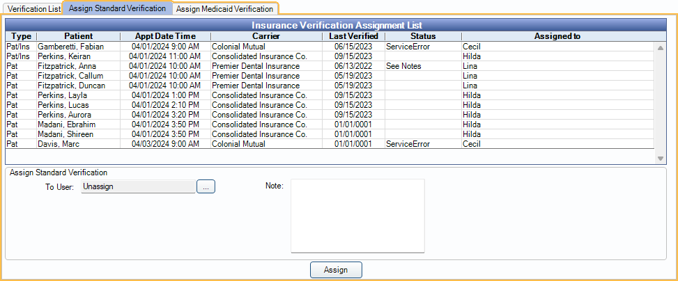 Users can be assigned to insurance verification from the two Assign Verification tabs. Column descriptions and filters are the same as the Verification List. Users must have the Insurance Plan Verification List Security Permission to be assigned insurance verification.