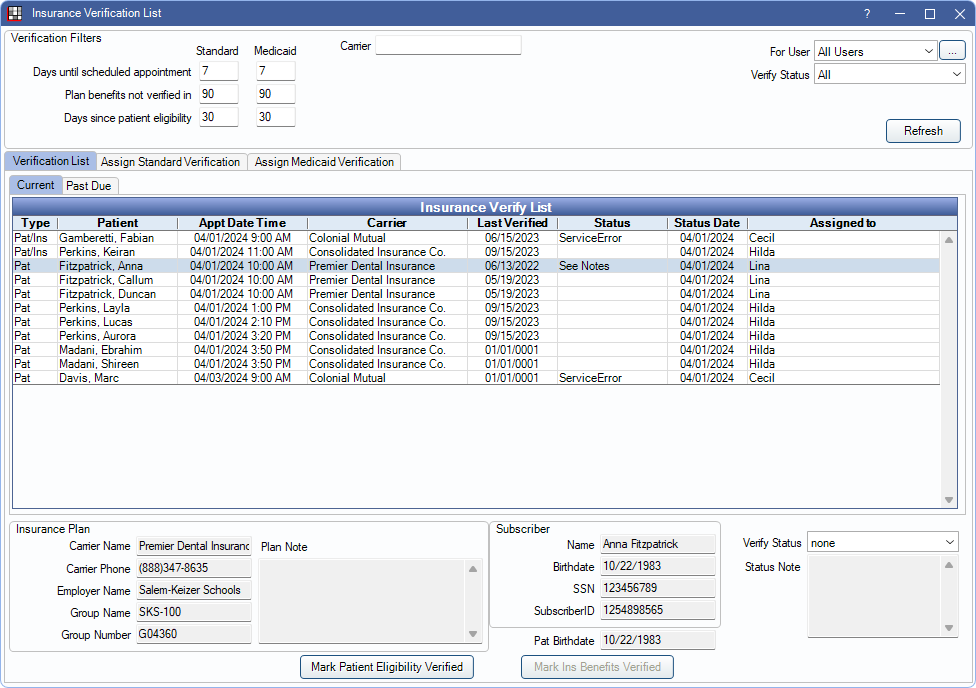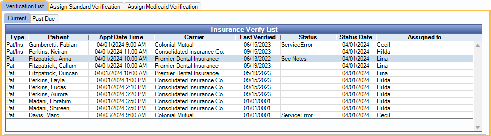 - Past Due: Verifications that meet filter criteria, yet are past due. Typically, this list should only include verifications for yesterday's appointments that need to be done as soon as possible. The number of days that determine past due status is set in Insurance Verification Setup.