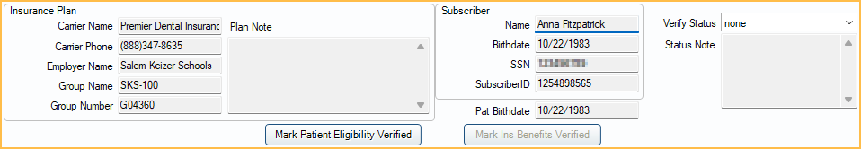 Subscriber: Information for the subscriber of the selected insurance plan. Also includes birthdate for the selected patient, which may differ from the subscriber. This is information that may be necessary to verify patient eligibility when office staff contacts a carrier.