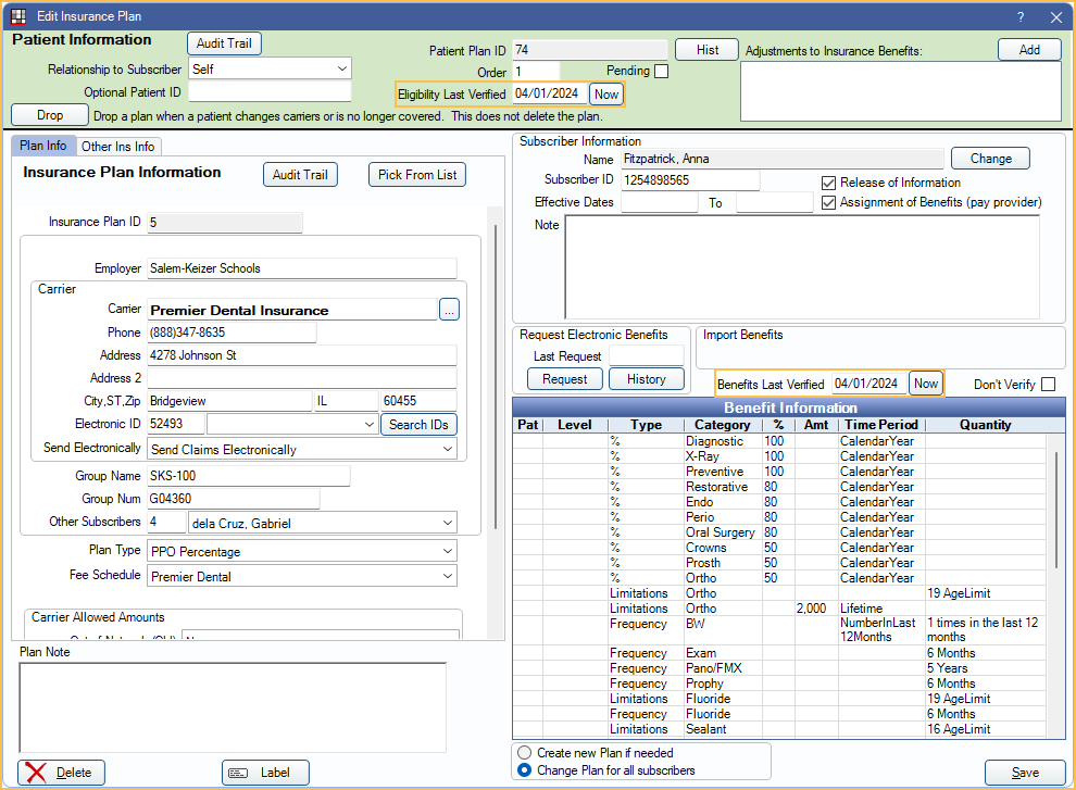 - Verify Insurance Plan: Mark insurance benefits as verified (Benefits Last Verified automatically updates).
