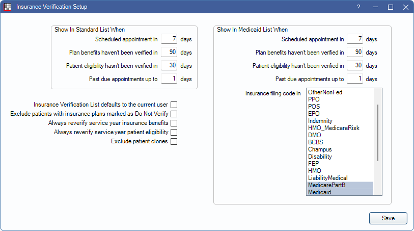 In addition to the Insurance Verification List, these settings are also used to determine which patients are checked during a batch insurance verification using Scheduled Processes.