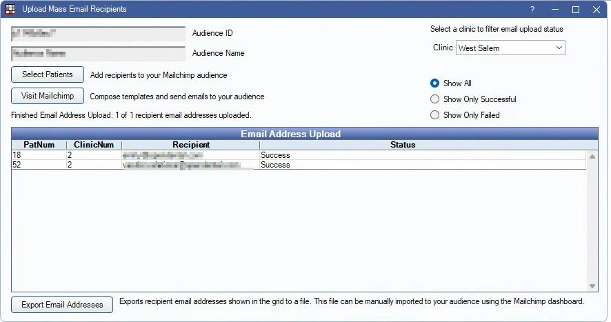 Export Email Addresses: Export email addresses to a separate file. This file can then be used to manually import patient email addresses to Mailchimp.