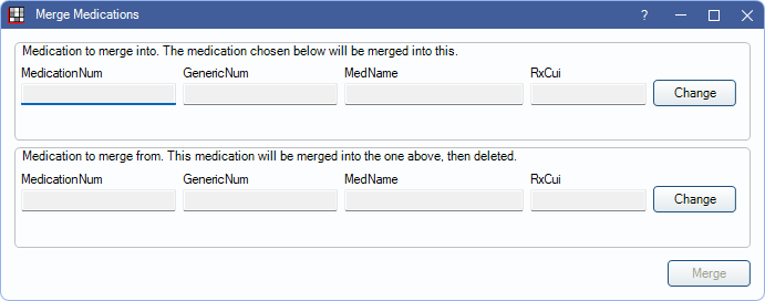 - Select the Medication to merge from. Click Change to select the medication that will be removed from the Medications List. Selected medication details are displayed.