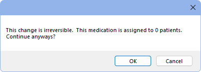 - If all medication fields match, the warning indicates the total patients assigned the Medication to merge from and that the change is irreversible.