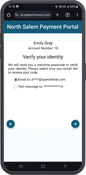When Verify and Pay is selected, the patient chooses how to receive verification. The patient then enters the verification code and can make a payment.