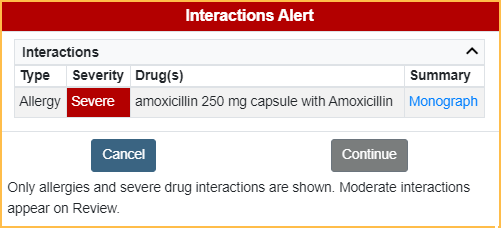 When prescribing or adding drugs in Ensora eRx, the system automatically checks for allergies. If a drug allergy exists, an interaction alert is displayed.