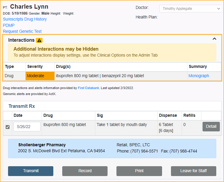 When prescribing a medication, drug-drug interaction warnings appear in the Transmit Rx window.