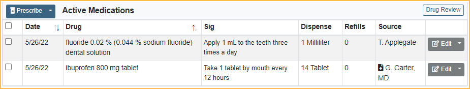 Ensora eRx uses the medications entered here when doing Drug Interaction Checks. When a user writes and transmits an electronic prescription, the medication is automatically listed here. However, medications entered directly in Open Dental are not currently passed to Ensora eRx; users must manually enter them.