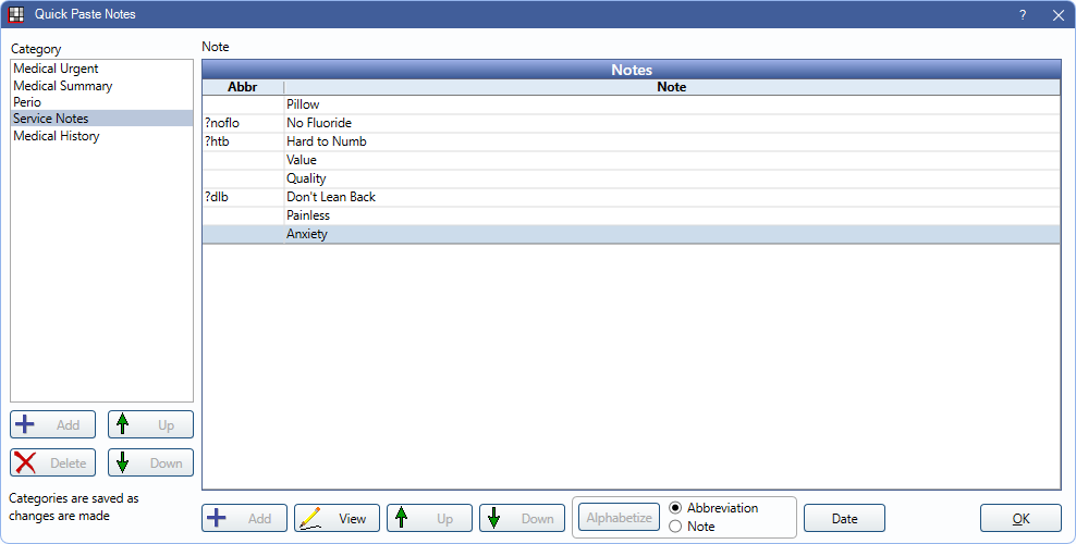 Auto Notes are templates used to insert frequently entered, large notes (e.g., for hygiene, root canals, materials, anesthetic, post op instructions). They can contain prompts and pre-filled text. Auto Notes can be edited in Auto Note Setup.
