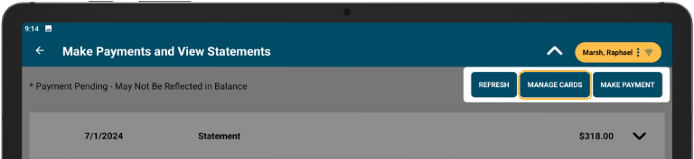 Open the caret menu at the top of screen for additional options and tap Manage Cards.