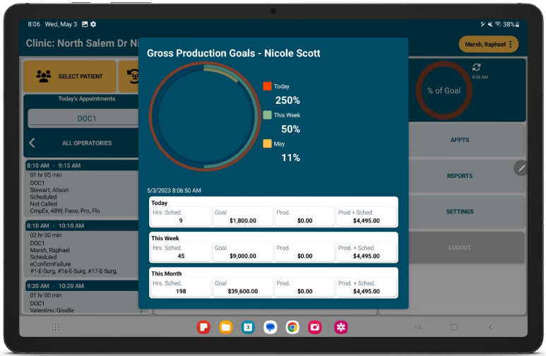 Provider Production Goals only displays when the logged-in user is associated with a provider. Providers must have an Hourly Production Goal entered in the Edit Provider window.