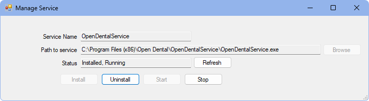 - Click Browse and select the OpenDentalService.exe. This is typically located in \Program Files (x86)\OpenDental\OpenDentalService\.