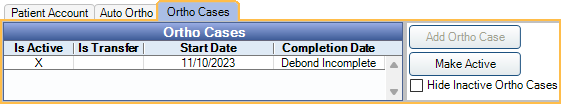 - Is Active: An X shows on the active Ortho Case. Only one case can be active at a time for a patient. Once the debond procedure is set complete, the case is deactivated.