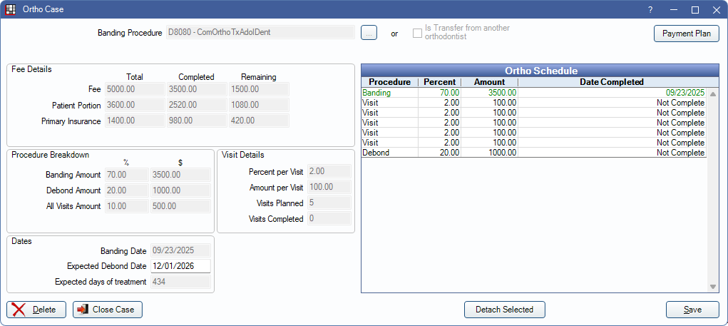 - Payment Plan: Click to create a Payment Plan for any completed procedures linked to the active Ortho Case. The completed procedures are automatically attached to the plan's production if not already attached to a plan. If a Payment Plan already exists for the Ortho Case, the button opens that plan instead of creating a new one.