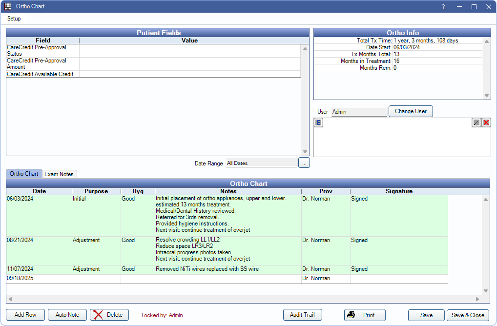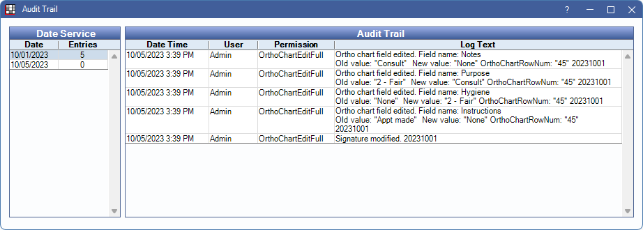- Audit Trail: View historical changes made on a dated entry. Both patient field and ortho chart changes are tracked.