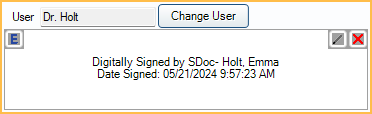 - Change User: Click to change the user who signed the note. Click the signature box to update, select the new provider, enter a signature, then click the signature box again.