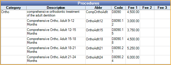 - Procedure codes for charging fees/billing insurance (typically standard ADA codes). Add suffixes to the ADA codes to differentiate multiple fees for the same procedure. Create procedure codes for common treatment lengths where the fee changes (e.g., D8080.18, D8080.24, etc.). Only the first 5 digits of the code are sent in claims; extra characters are dropped when billing. See examples below.