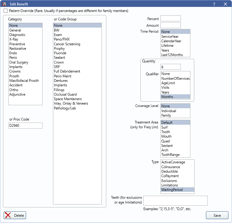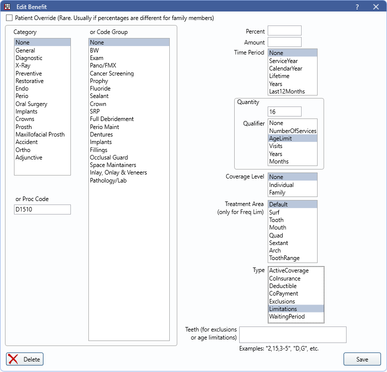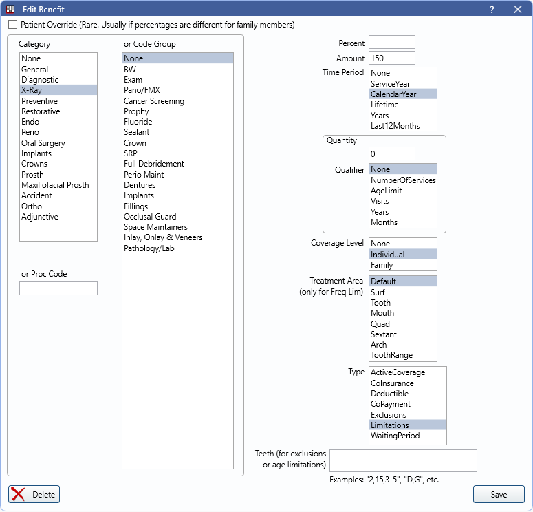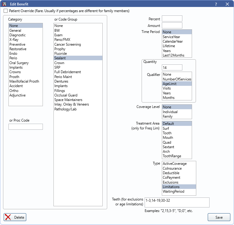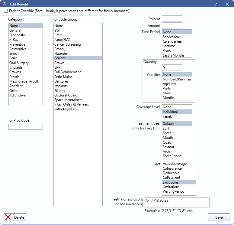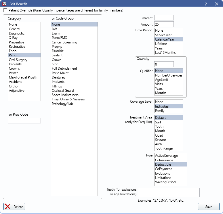 Alternatively, use Code Groups to create custom procedure groupings to accommodate benefits without editing standard insurance categories.