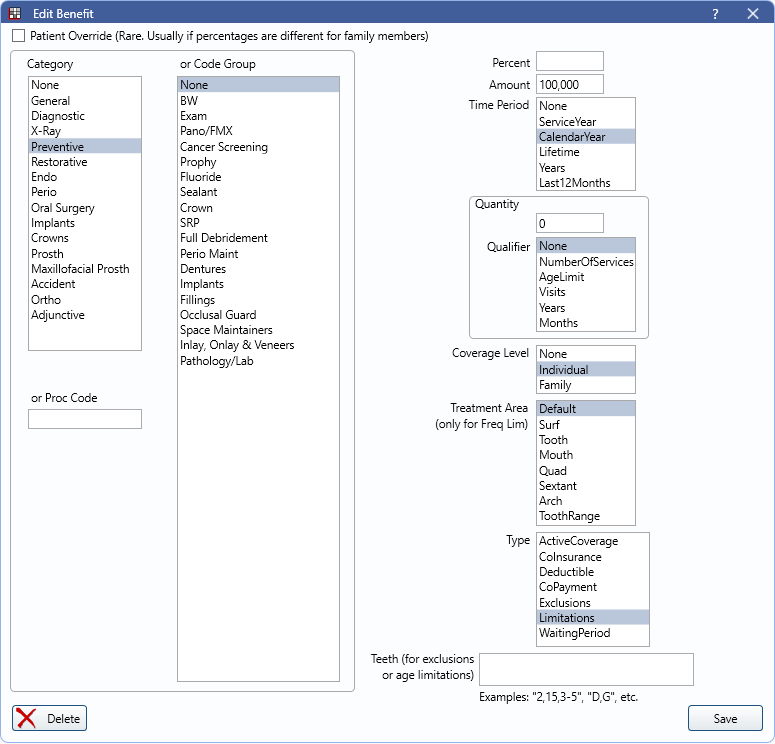 The time period can also be set as ServiceYear if appropriate. Test in the Treatment Plan Module (e.g., add a $10000 preventive procedure and a $200 filling to make sure it behaves as expected.)