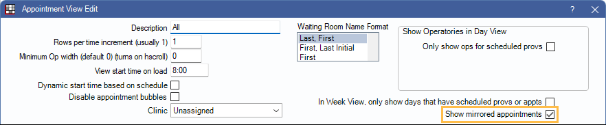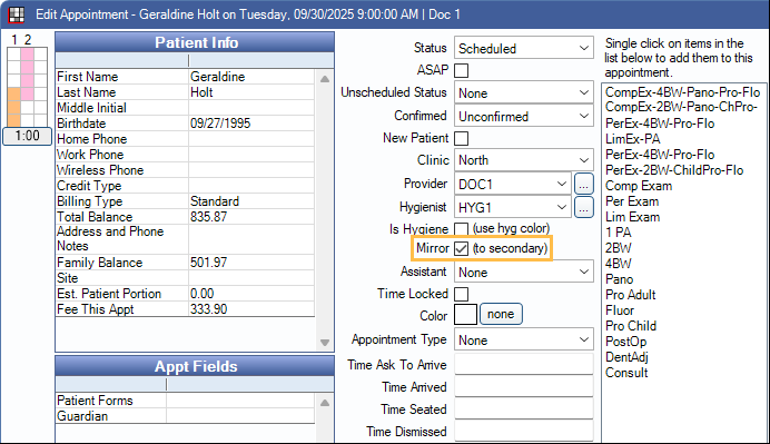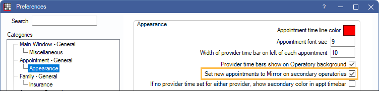 Optionally, to automatically mark newly created mirrored appointments, set the preference, Set new appointments to Mirror on secondary operatories.