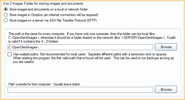 Store Images directly in database. No AtoZ Folder. (Some features unavailable): Only visible if this option is currently in use. See Store Images in Database. If selected, images will be stored in the database and it will become very large. There will be no A to Z folders. Once this option is disabled, it will no longer be available in the Paths list. Contact Open Dental Support to re-enable this option.