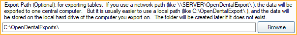 Export Path: This can be a local or network path. If the folder does not already exist, it will be created automatically when you export a report. The default folder is OpenDentalExports.