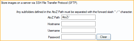 Store images on a server via SSH File Transfer Protocol (SFTP): Store images on a file transfer protocol (FTP) site using SFTP. An internet connection is required. Enter the following details: