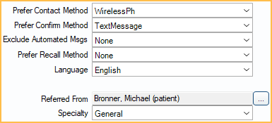 - Prefer Recall Method: Preferred method when scheduling recall appointments. The corresponding contact information is shown in the Contact column of the Recall List.