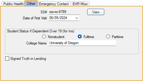 - Users with the Patient Social Security Number View permission can click View to see the full number.