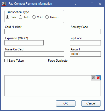 Use the PayConnect Payment window to take payments, add new cards, void a transaction, or process a return.