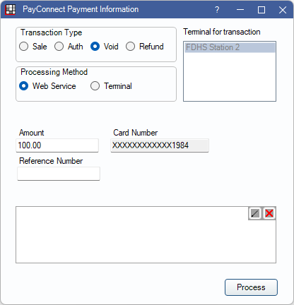 - In the PayConnect Payment window, select Void and enter the Reference Number.