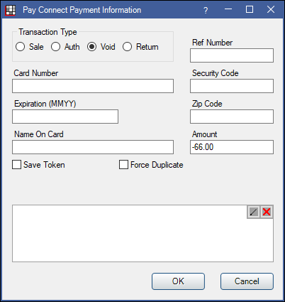 - In the PayConnect Payment window, select Void and enter the Ref Number, Card Number, Expiration Date, and Security code of the original transaction.