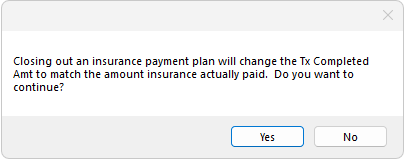 Click Yes to proceed with closing the payment plan. The Tx Completed Amt is adjusted to match the Paid so far amount. Click No to return to Insurance Payment Plan window without closing the payment plan.