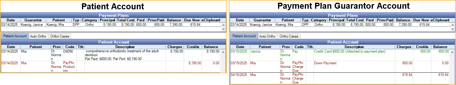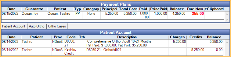 Age Credits and Debits (Default): Charges Due, payment plan production, and payments show as line items in patient account grid and affect balances and aging.