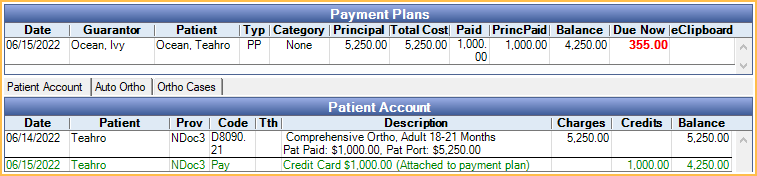 Charges Due, payment plan production, and payments show as line items in patient account grid and affect balances and aging.