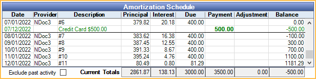 Patient has a $4500 payment plan that had a $0 balance as of 07/01/2022. Their next payment of $400 is not due until 08/01/2022. On 07/12/22, they made a payment of $500, making the payment plan balance $-500.