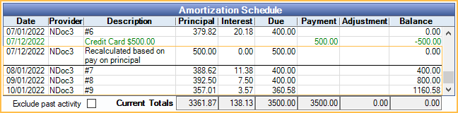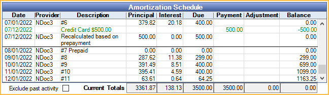 If Prepay is selected as the Payment Allocation Method and interest is also recalculated, the prepayment will be applied to future payments (e.g., payment #7). Any payments that were paid in full, will be noted Prepaid.