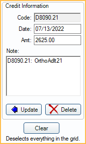 To add a credit for a procedure, highlight the procedure first. The credit fields populate with the procedure information. Modify if needed, then click Add. A procedure can only be attached to one Payment Plan. It cannot be attached to both an Old Payment Plan and Payment Plan.