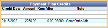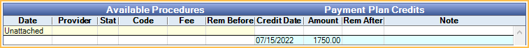 Credit Information: Add, update, or remove credits in the Payment Plan Credit area. Credits can be attached to available procedures or unallocated (not recommended). If unallocated, Payment Plan payments are not split to specific adjustments or procedures.