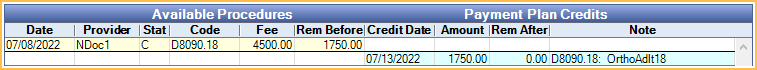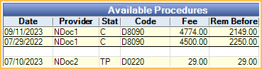 Available Procedures: Procedures with a Rem Before amount other than $0 are listed in yellow. Any treatment credits attached to other Old Payment Plans are considered in the Rem Before amount.