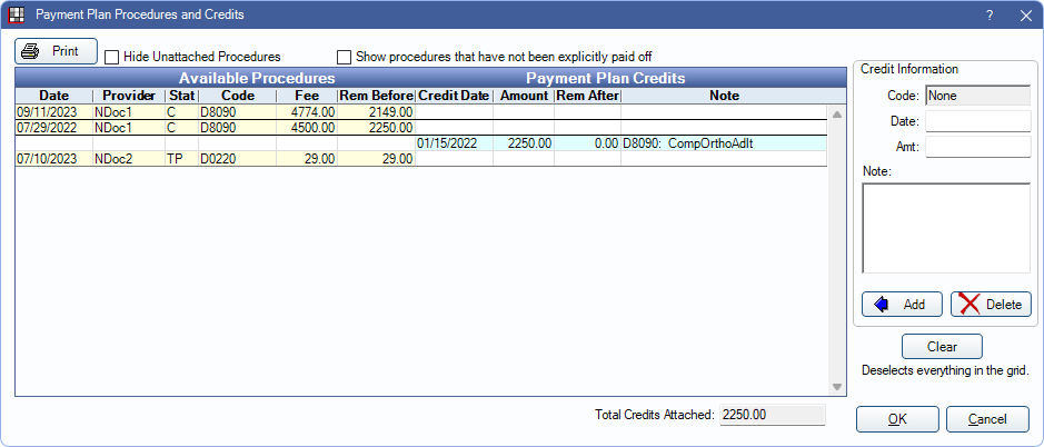 Print: Print a list of the procedures and credits that currently show in the Available Procedures/Payment Plan Credits grid.