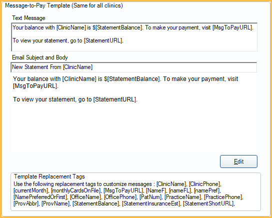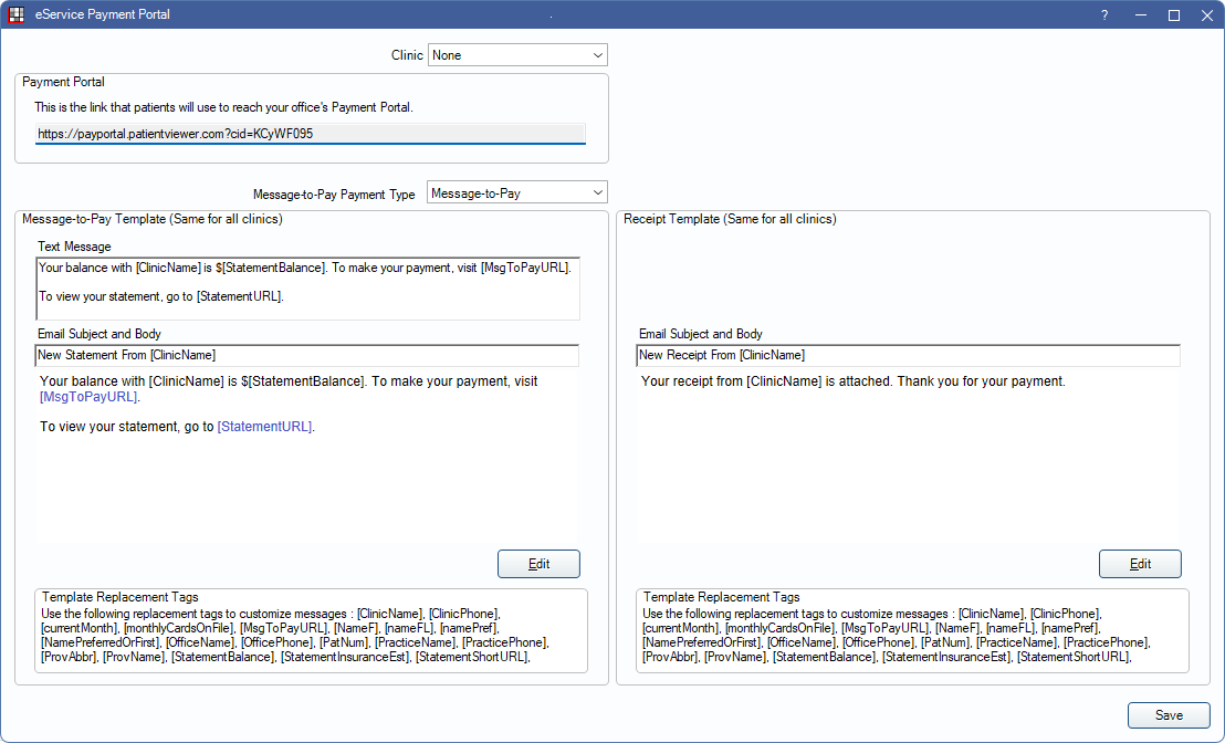 Note: The [MsgToPayURL] tag is required. This sends the patient to the Payment Portal to make a payment. If missing, an