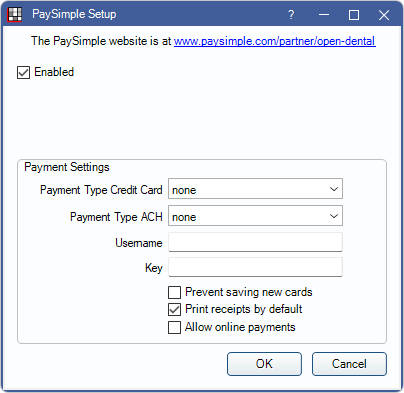 Enabled: Check to enable to PaySimple Program Link. Enter Payment Settings below.